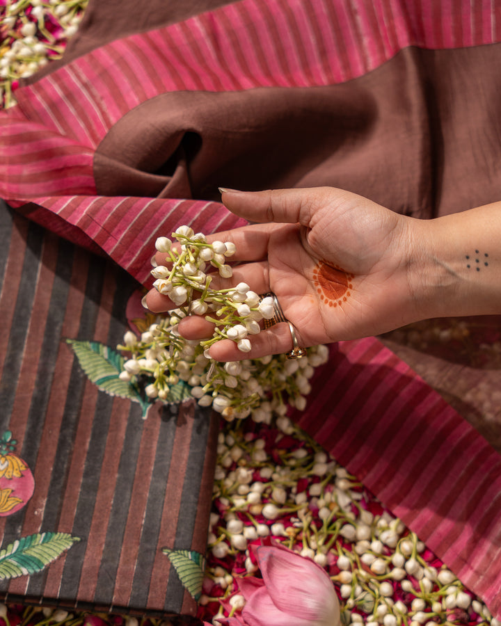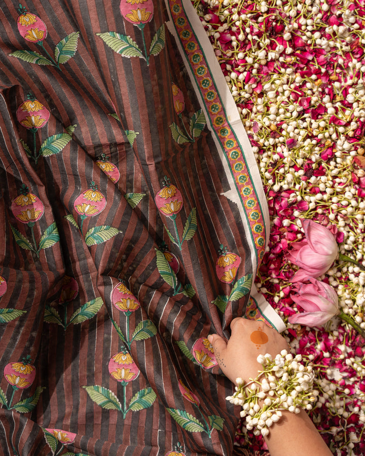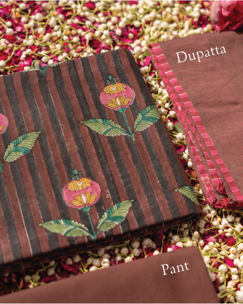 The Anaari Print is a special one. A Contemporary print merging the ever classic stripes with a rather traditional Pomegranate Motif, the print is designed exclusively for the store. Hand Block Printed in Rajasthan, the fabric is good as a dress or a simple shirt or a flared lehenga, all the same.