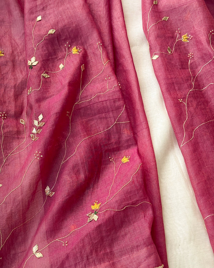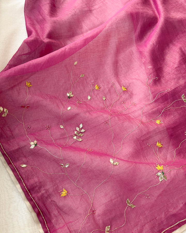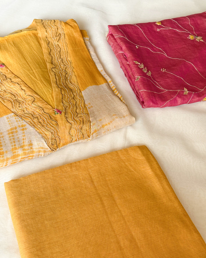 Daria is a fun, modern yet very wearable Tissue Chanderi Kurta. With hand Shibori in the Body and details of Hand Embroidery in Gota Patti on the neck and Sleeves.