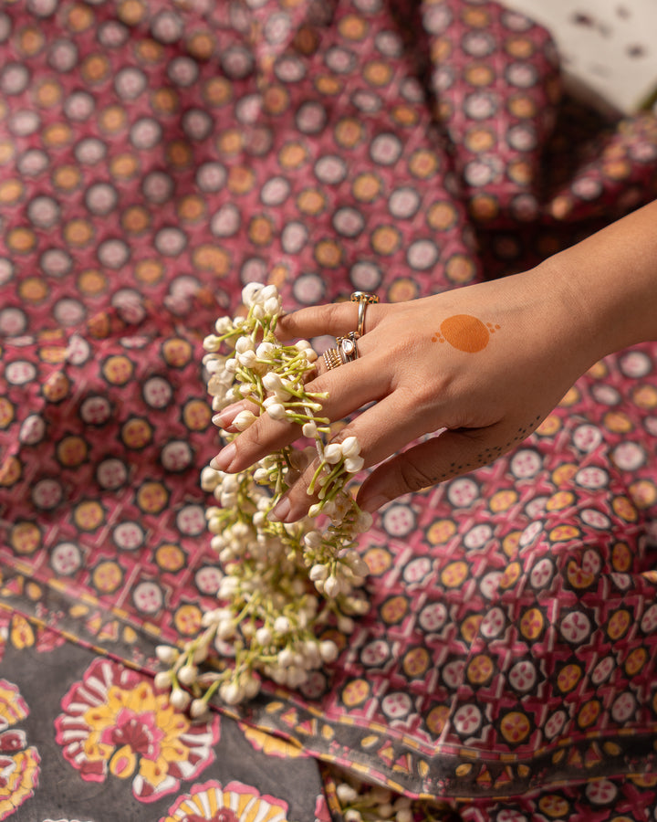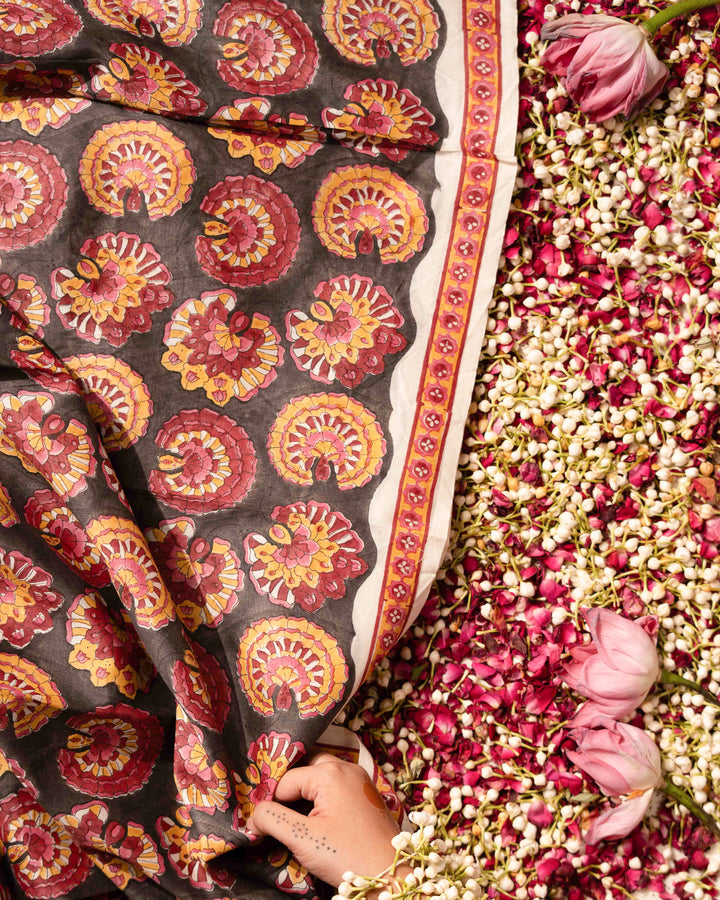 Phulwari is a Maximal Floral print, imagine a row of Indian winter flowers and their colours embodied onto fabric. The colours are subtle and good for day events, flowy dresses and a happy mood.