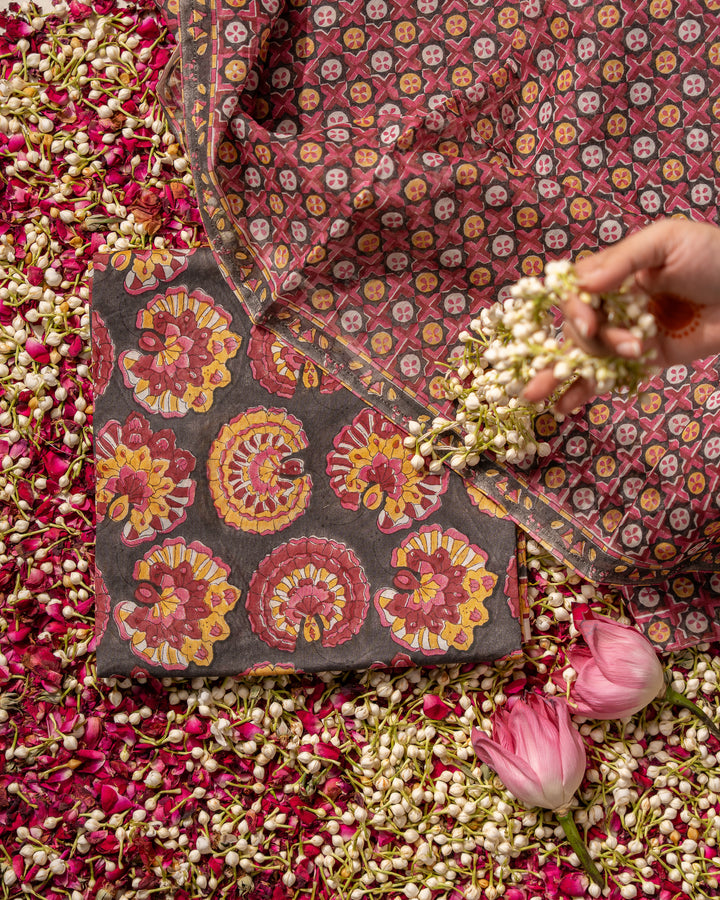 Material- Heavy Chanderi (50% cotton, 50% Silk) Width- 44 inches Technique- Hand Block Printing Phulwari is a Maximal Floral print,...