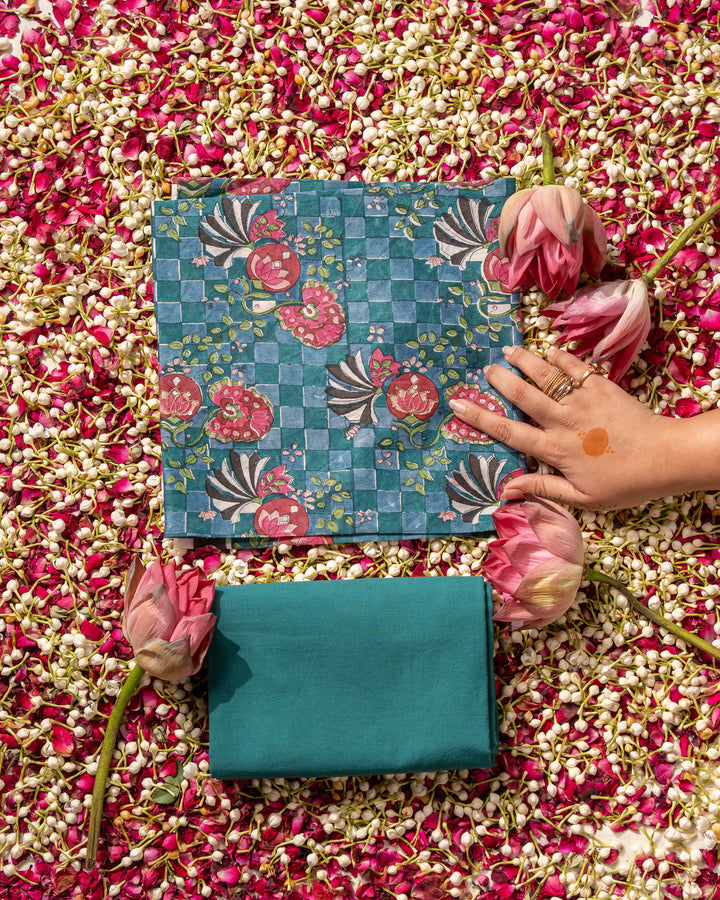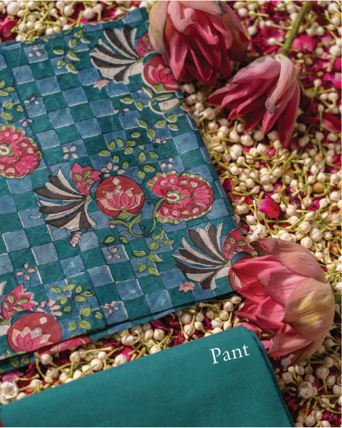 Heer is so far one of our most ambitious prints, the checkered texture in the background, adds a contemporary dynamism that matches with the style of motif making and placement, though the elements are rather traditional, the overall combination gives the fabric a fuller look. Hand block printed used 9 colours, this Modern Jaal is made for special occasions, and bound to make heads turn.
